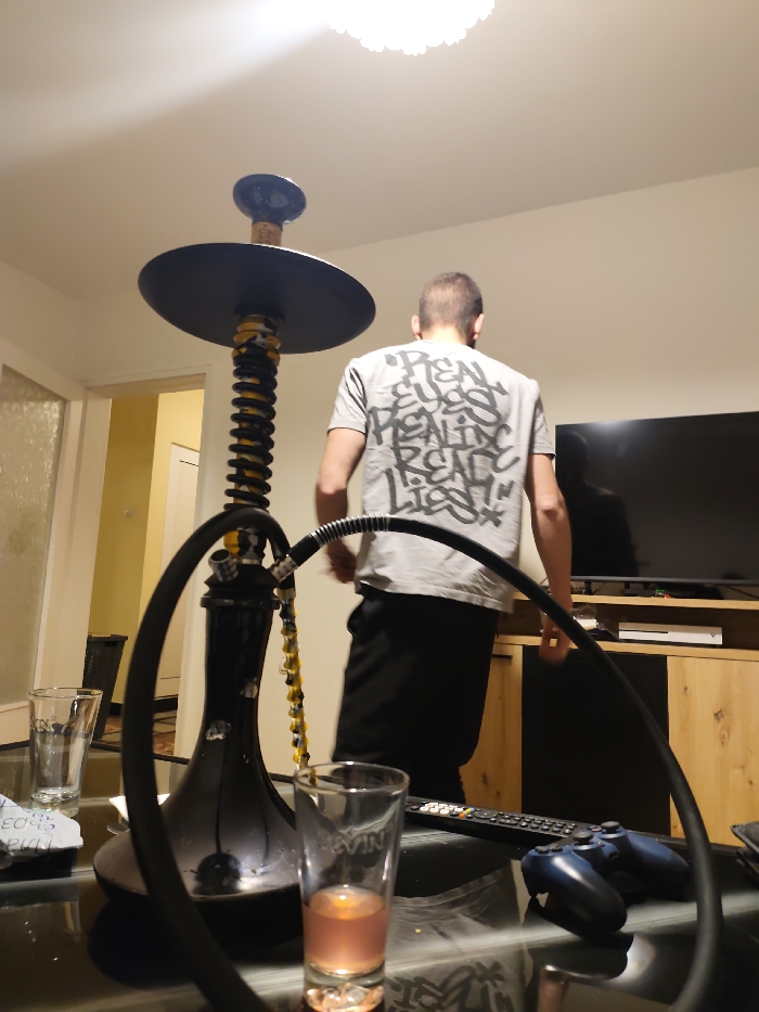 The scene depicts an indoor residential area, identified as a private residence in Plovdiv, Bulgaria. In the foreground, a dark-colored hookah with a yellow coiled stem and black base stands prominently on a reflective dark table. A black hose extends from the hookah. Adjacent to the hookah on the table are two clear glasses; one contains a pinkish-orange liquid, and another is empty. A black remote control and two dark blue PlayStation controllers are also on the table. In the mid-ground, a male individual is visible from the back, standing upright. He has short, buzz-cut hair and wears a light grey t-shirt with black graffiti-style text on the back, including partially visible words such as "REAL," "REALITY," "READY," and "LIES." He is also wearing dark trousers or shorts. The background on the right features a flat-screen television placed on a wooden entertainment unit, which holds a white gaming console. On the left, a doorway leads to an adjacent room with yellow-painted walls, where a dark bin is partially visible. The ceiling is light-colored and features a decorative light fixture. The overall lighting suggests an interior setting with artificial illumination.