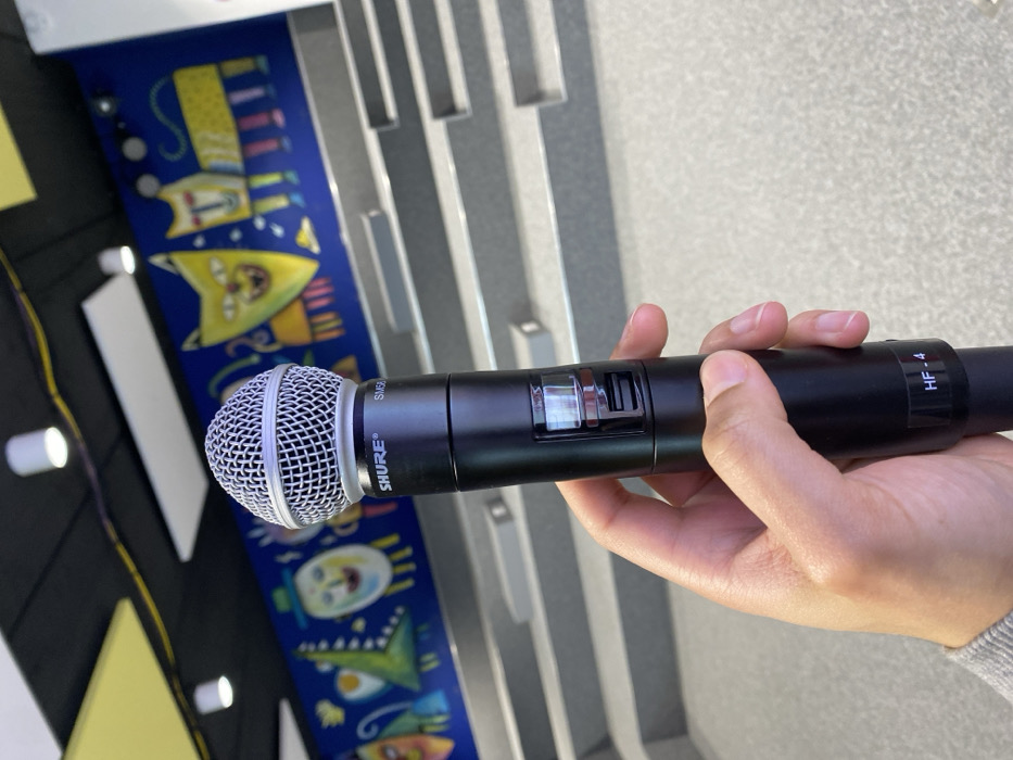 - "A human hand, displaying light skin and wearing a grey sleeve, holds a black Shure SM58 wireless microphone in the foreground of an indoor space in Suresnes, France" by FM-JcQ6F3, licensed under CC BY 4.0