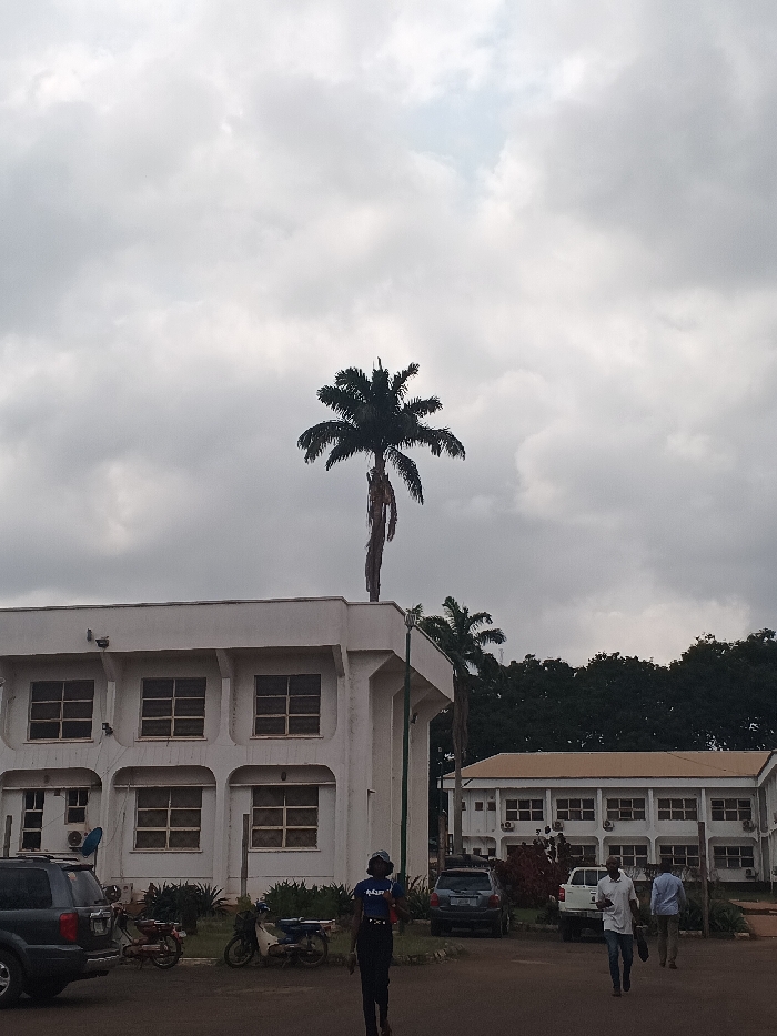 The scene depicts an outdoor urban environment, identified as being in Nsukka, Nigeria, under an overcast sky characterized by dense, light grey clouds