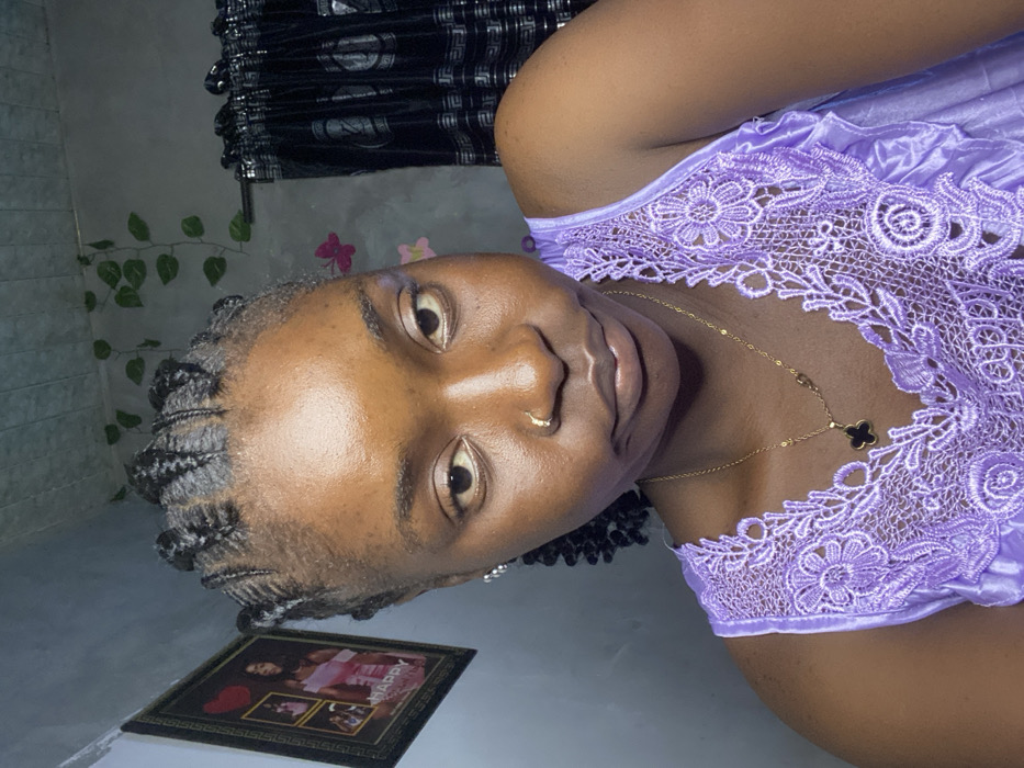 A woman with braided hair and a nose ring wears a lilac top with floral lace detailing and a gold necklace featuring a black clover pendant. She is photographed from a close-up, slightly angled perspective. Behind her are a photo frame, a decorative vine, and a dark, patterned curtain. The lighting appears to be soft, emphasizing her skin's natural sheen. The scene has a relaxed and intimate feel.