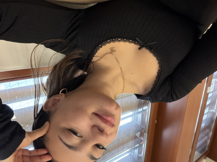 The image displays a close-up portrait of a female individual, situated indoors in Schiltigheim, France. She possesses dark brown hair and is adorned with a gold hoop earring on her visible right ear. Her attire consists of a black, long-sleeved, ribbed garment featuring a square neckline with black lace trim and a central black bow. A thin gold chain with an irregularly shaped pendant rests on her chest. Her right hand is positioned with fingers touching her right temple. The subject is looking directly into the camera with a slight smile, her lips slightly parted. The background reveals a window with brown wooden frames and horizontal white blinds, through which diffused ambient light is observable.