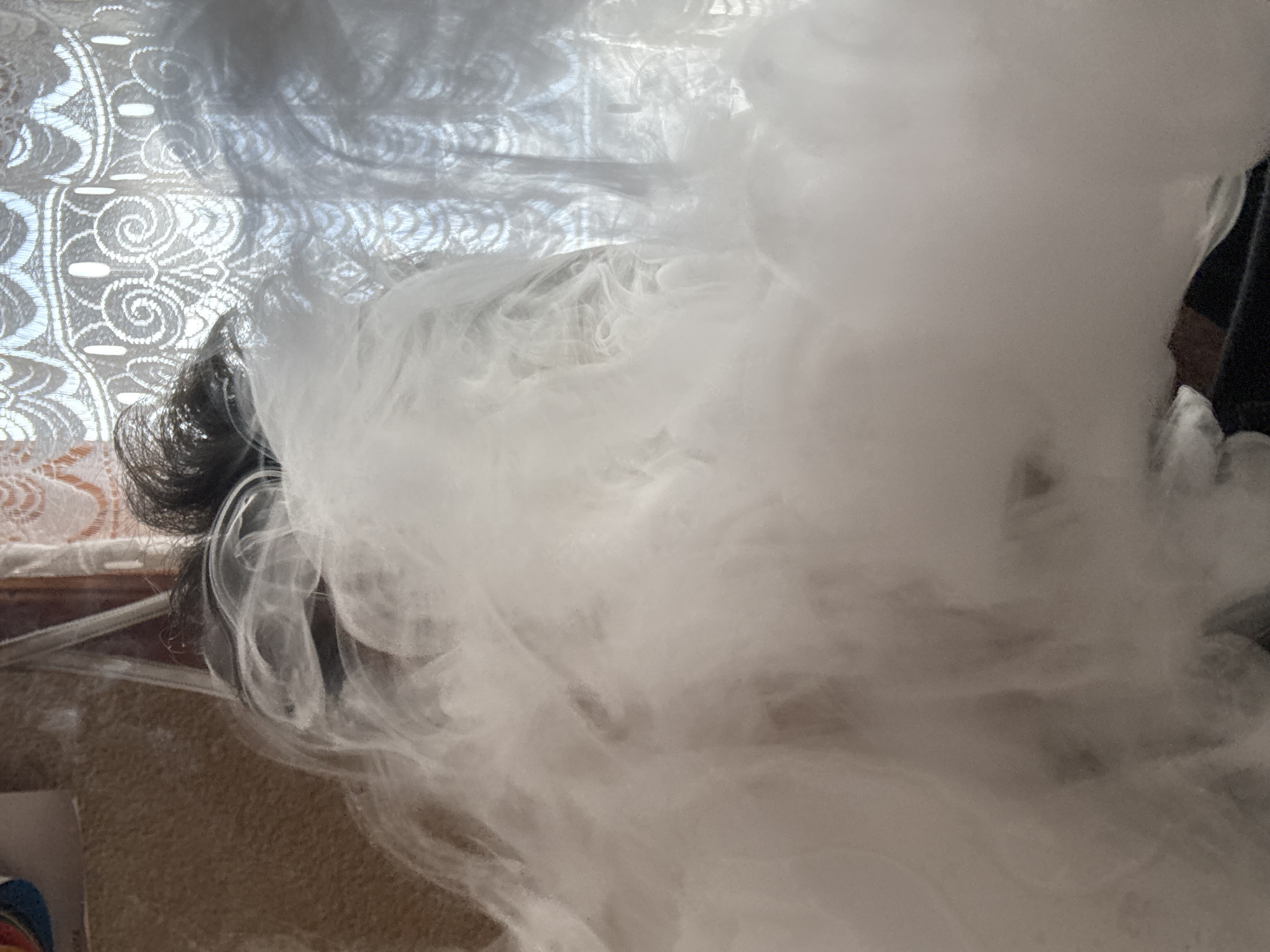 The image depicts a room with smoke filling much of the frame. In the upper left, a window is partially visible behind a lace curtain. Below the window, some dark hair is visible. In the lower foreground, a carpeted floor is visible. The location is not discernible from the image.