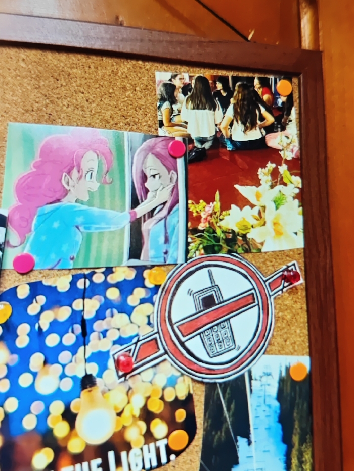 An upward-angled view captures a section of a cork board adorned with various pinned items, set within a dark brown wooden frame against an orange wall. Clockwise from the top right: 1. A photograph depicts a group of approximately eight young females, mostly seen from behind, seated in a semicircle on a red floor. Several individuals have long, dark hair. One female in the center wears a white top and jeans. An orange pushpin secures this photo in its upper right corner. 2. Below the group photo, a portion of an image displays white and yellow flowers with green foliage against a red background, suggesting a floral arrangement or garden. 3. To the immediate left of the floral image, a stylized graphic, approximately circular with an extended horizontal bar, features a white background, black outline, and a prominent red diagonal line. Inside, a monochrome illustration of a vintage mobile phone with an antenna and keypad is depicted, signifying a "no mobile phone" symbol. Two red pushpins secure this graphic. 4. At the bottom right, a vertical photograph shows a light-colored, possibly snowy or icy, vertical landscape feature, flanked by darker, indistinct elements on either side. An orange pushpin is visible on its lower right. 5. At the bottom left, a rectangular print displays a dark blue background filled with numerous out-of-focus circular yellow-orange lights, creating a bokeh effect. A single, illuminated incandescent light bulb hangs prominently in the lower left foreground. Partial text at the bottom edge reads "...THE LIGHT." An orange pushpin is visible on its lower right. 6. Above the bokeh print, a vertical artwork, possibly a print or drawing, illustrates two anime-style female characters with pink hair. The character on the left, with curlier hair and wearing a light blue hoodie with white stars, extends her right hand to gently touch the cheek of the character on the right. The character on the right has straighter hair, a thoughtful expression, and her left hand near her chin. Both appear to be looking at each other. Two pink pushpins secure this artwork, one on the upper right and one on the lower left. The location is Unknown, Unknown.