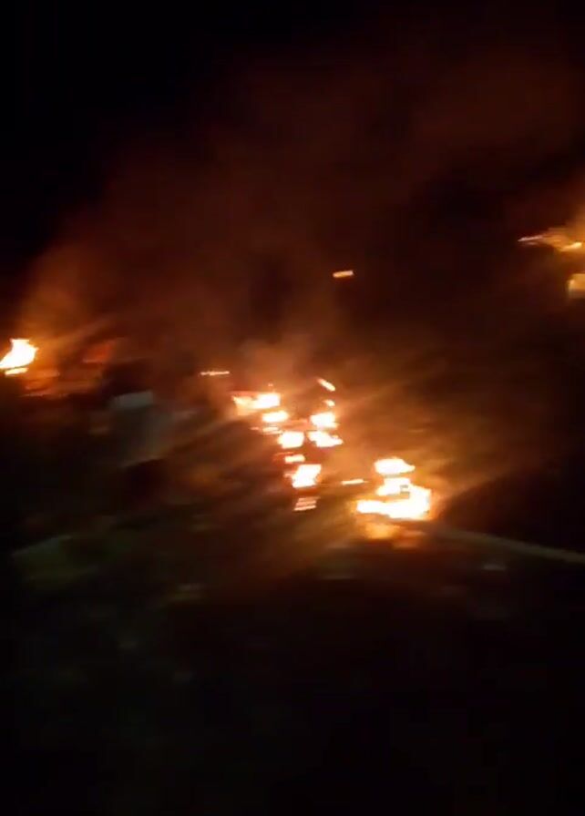 fire burning at night. There is smoke in the air. The flames are bright and appear to be spread across a small area. The ground is visible in places, and there appears to be some vegetation. The video is shaky and taken from a low angle.
