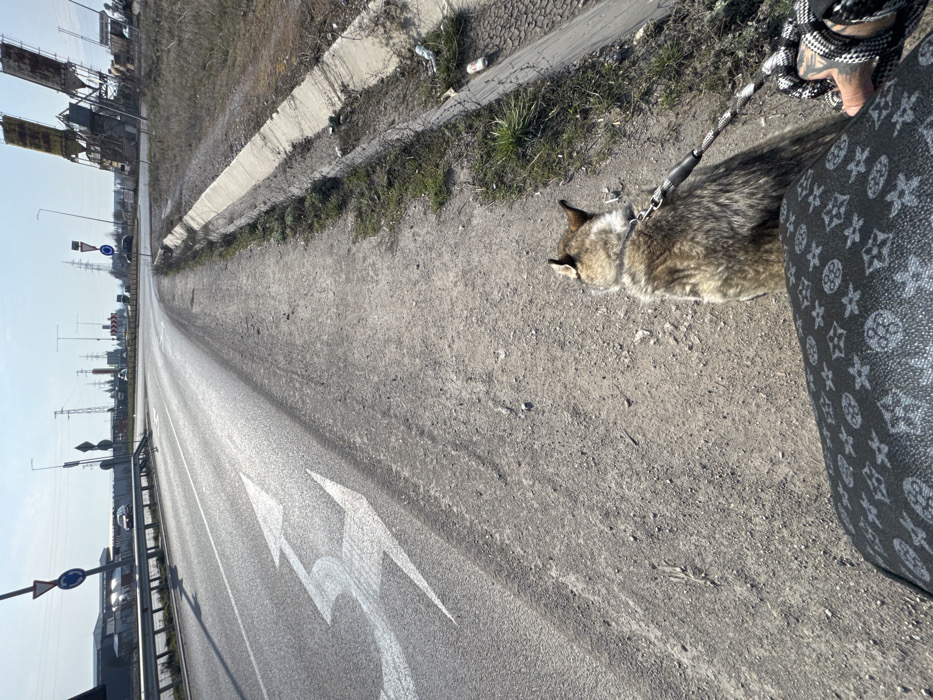 An outdoor, daytime image taken from a first-person perspective depicts a person walking a dog on the shoulder of a road in Kostinbrod, Bulgaria