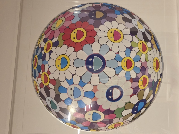 A circular artwork, enclosed in a glass frame, presents a field of stylized flowers