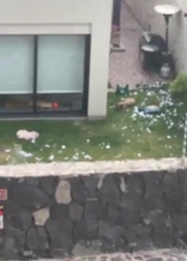 The video depicts a residential backyard with a green lawn scattered with white debris, likely styrofoam