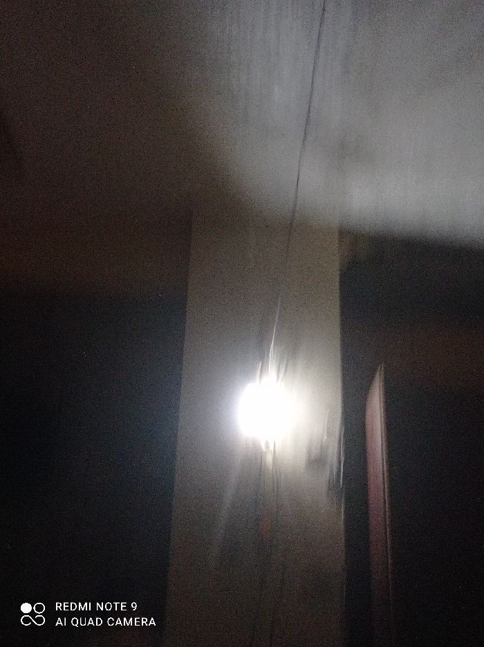 The image depicts an interior scene in Khan Yunis, Palestinian Territory, characterized by low ambient lighting. A bare, illuminated incandescent light bulb, emitting a strong white glare and distinct light streaks, is prominently positioned slightly right of the vertical center. Multiple thin, dark electrical wires descend from the ceiling, with at least one appearing to connect to the light source. The surrounding environment consists of plain, muted grey walls and ceiling, indicative of poor illumination. A sharp vertical structural element, possibly a wall corner or doorframe, is visible on the right, with a narrow reddish-brown vertical strip along the far right edge. No individuals or specific actions are discernible. The image exhibits digital noise, consistent with a low-light photograph captured by a 'REDMI NOTE 9 AI QUAD CAMERA', as indicated by the watermark in the lower-left corner.