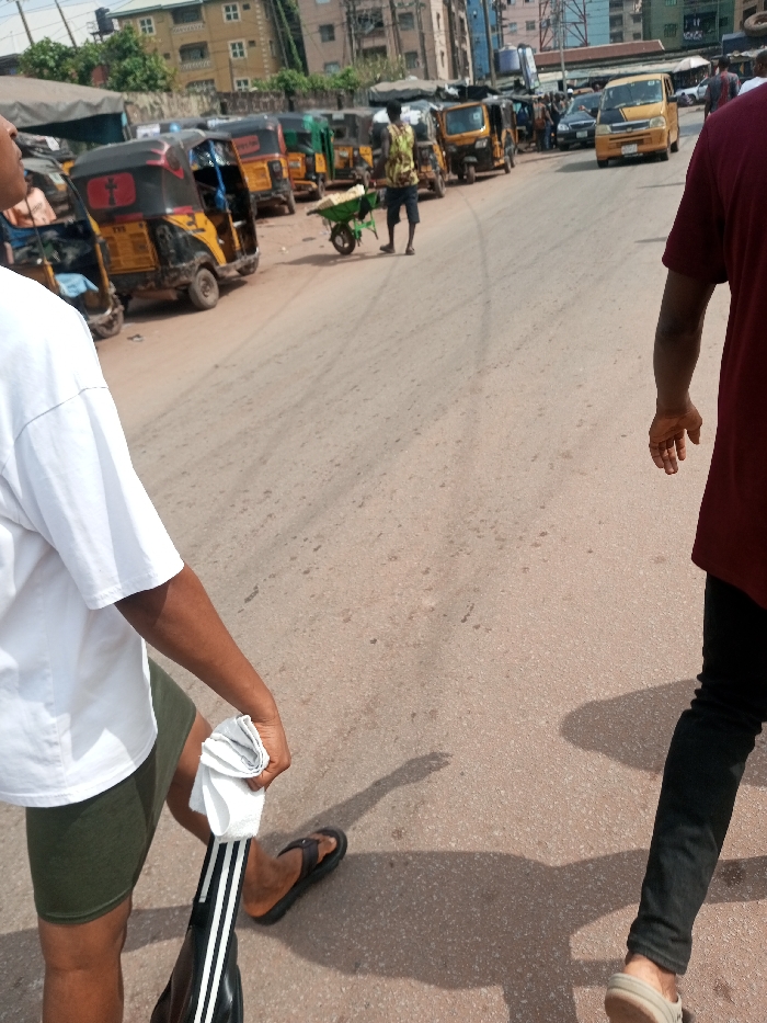 The image depicts an urban street scene in Onitsha, Nigeria, characterized by human activity and parked vehicles under bright daylight. In the foreground, partially visible on the left, a person wearing a white t-shirt, olive green shorts, and black flip-flops walks forward, holding a folded white cloth and a black bag with white stripes. To the right, another person, also partially visible, walks forward wearing a maroon t-shirt, black pants, and light-colored shoes. Both individuals cast distinct shadows on the light-colored asphalt road. In the midground, a person wearing a patterned t-shirt and dark shorts pushes a green wheelbarrow filled with light-colored produce. To the left of the road, a line of yellow and black tricycles (Keke Napep/Marwa) is parked alongside a covered area, possibly a market stall or vehicle park. Further down the road on the right, a yellow commercial van is visible, along with other distant vehicles and pedestrians. The background features multi-story buildings, some with visible windows and flat roofs, indicating a densely populated area. The sky is clear, suggesting sunny weather.
