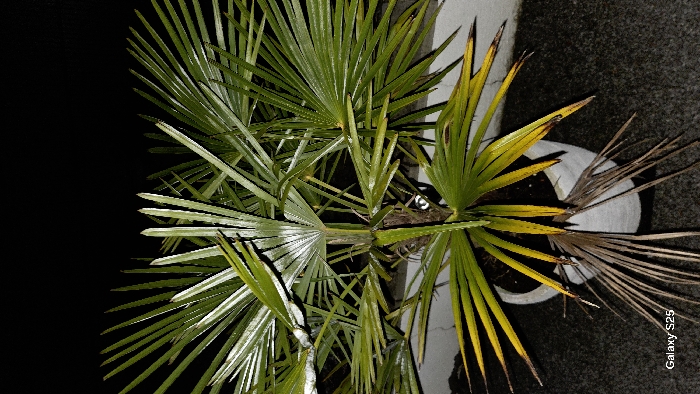 A top-down shot displays a potted palm. The left side features healthy, vibrant green fronds, while the right side showcases yellowing and browning leaves, some fully dried. The plant sits in a white pot. The background transitions from solid black on the left to a textured gray surface on the right. "Galaxy S25" is visible in the lower right corner.