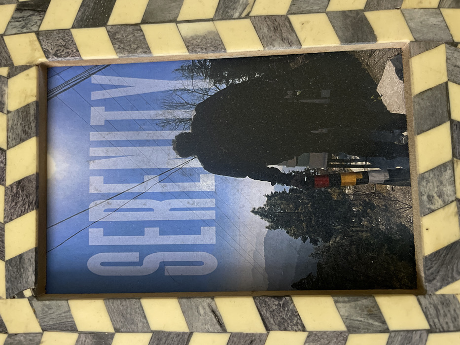 The image is of a picture frame with a photograph inside. The frame is made of bone and is decorated with a checkered pattern of black and yellow. The photograph is in a landscape format and depicts a silhouette of a person walking away from the camera. The person is walking on a path lined with trees, against a backdrop of a blue sky with power lines, and a distant mountain range. The word "SERENITY" is printed in large letters across the sky of the photograph, with a yellow and red object visible in the foreground. The coordinates provided place the location in Jaipur, India, which is the capital of the Indian state of Rajasthan. The photograph is a snapshot of a person walking in a serene environment, seemingly far from the hustle and bustle of the city.