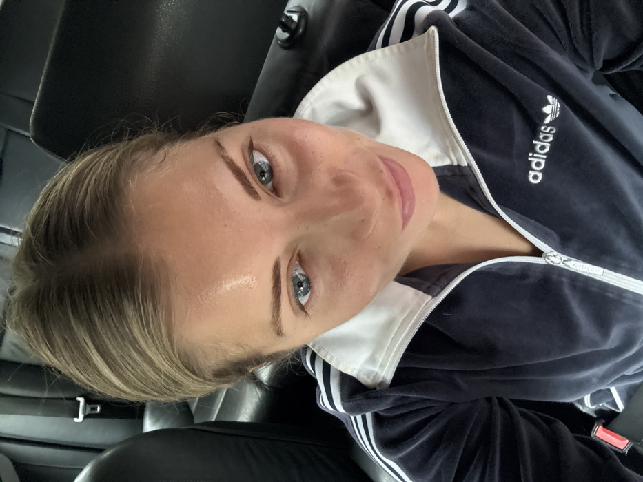 A female is depicted in a close-up selfie taken inside a vehicle, located in Roubaix, France. She has fair skin, blue eyes, and light blonde hair pulled back with a visible part. Her expression is neutral as she looks directly at the camera. She is wearing a navy blue velour track jacket with a white full-length zipper, a white collar, and three white stripes on each sleeve. A white "adidas" logo with the trefoil emblem is visible on the left chest area of the jacket. The interior of the vehicle, visible in the background, consists of dark, likely black, leather seats and a headrest. A red seatbelt buckle is partially visible on the lower left of the frame.