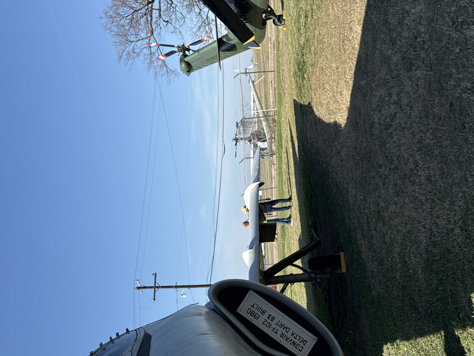 A landscape-oriented image shows a sunny day with aircraft on display. In the foreground is a ConVair TF-102 Delta Dart 63 from 1980. Further back, there's a fence with another aircraft and two people. A utility pole extends into the clear blue sky. A green helicopter hovers in the upper portion of the frame, and bare branches of a tree extend near it. The right of the frame has a large grassy field.