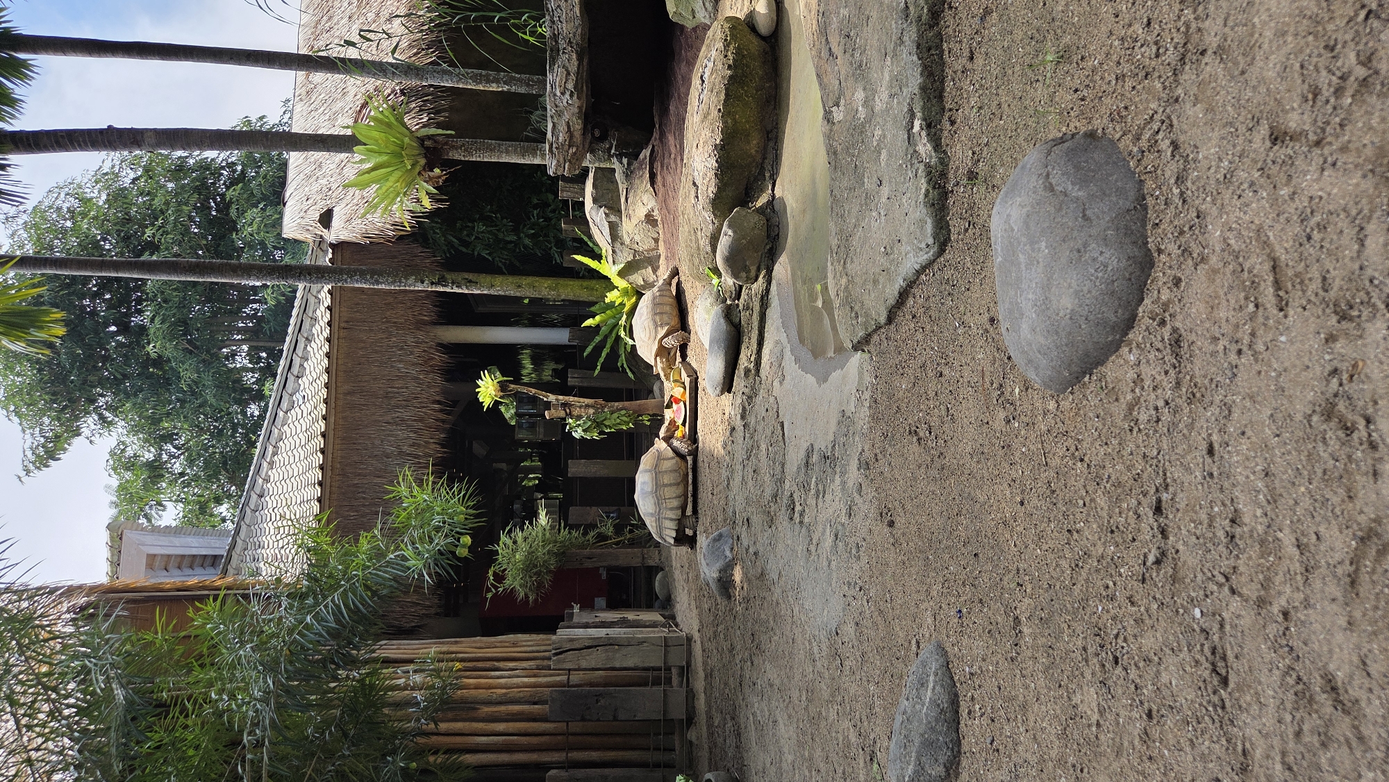 The image depicts an outdoor area in Celuk, Indonesia, featuring a thatch-roofed building on the left and a small, rocky enclosure in the center. Two tortoises are near a feeding area containing fruit. The ground is sandy, with scattered rocks. Vegetation is visible throughout the scene, including trees, shrubs, and ferns.