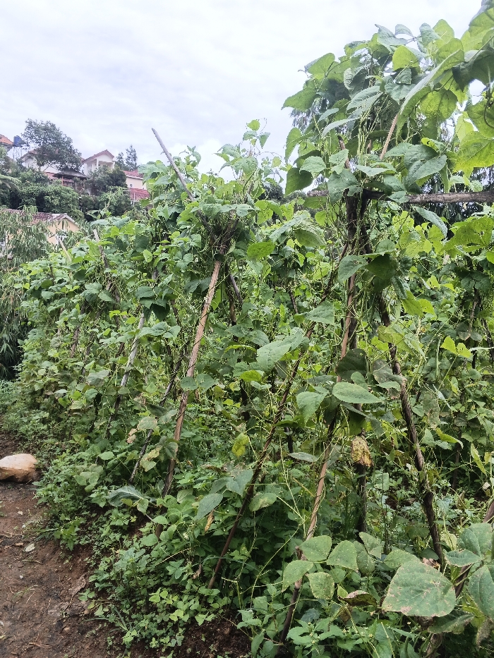 A lush vegetable garden scene showcases bean plants climbing on wooden poles. The plants are dense with foliage, some showing signs of wear or disease. The garden is thriving in what appears to be an overgrown patch, with miscellaneous weeds interspersed. In the background, houses are nestled on a hill under a cloudy sky, suggesting a rural or semi-rural setting. A large rock sits on the edge of the garden bed.