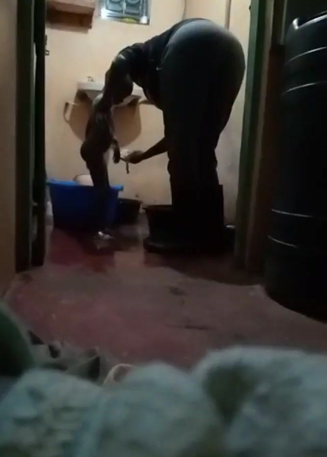 n adult bathing a small child in a bathroom. The adult, who is wearing dark clothing and boots, is bent over, pouring water over the child's head with a small black bucket. The child is standing in a blue plastic tub. The bathroom has a sink and a window with a security grille. The floor appears to be red tile, and there is some water spilled on the floor. The video is taken from a low angle, looking into the bathroom. A white object is visible in the foreground, possibly a blanket or pillow. There's a large black water tank next to the right doorway of the bathroom.