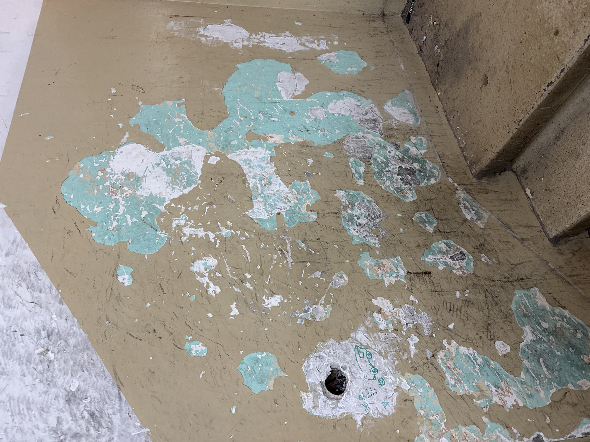 A close-up shot shows a deteriorated floor. The original surface appears to be a dull, tan color. Significant areas of the floor are covered with patches of a faded teal paint, and in some spots, a layer of white paint. Scratch marks and discoloration are visible across the surface. In the lower center of the frame, a circular hole is present. The location of this scene is not explicitly stated and therefore cannot be included in the description.