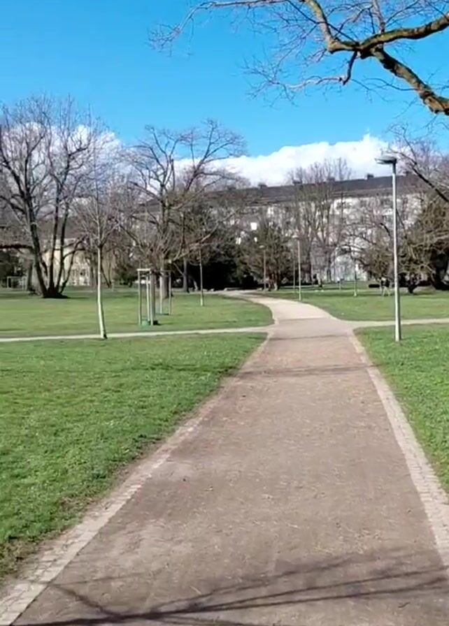 park on a sunny day. A path runs through the park, bordered by green grass. There are several trees without leaves. In the background is a building. The camera moves along the path, showing more of the park.