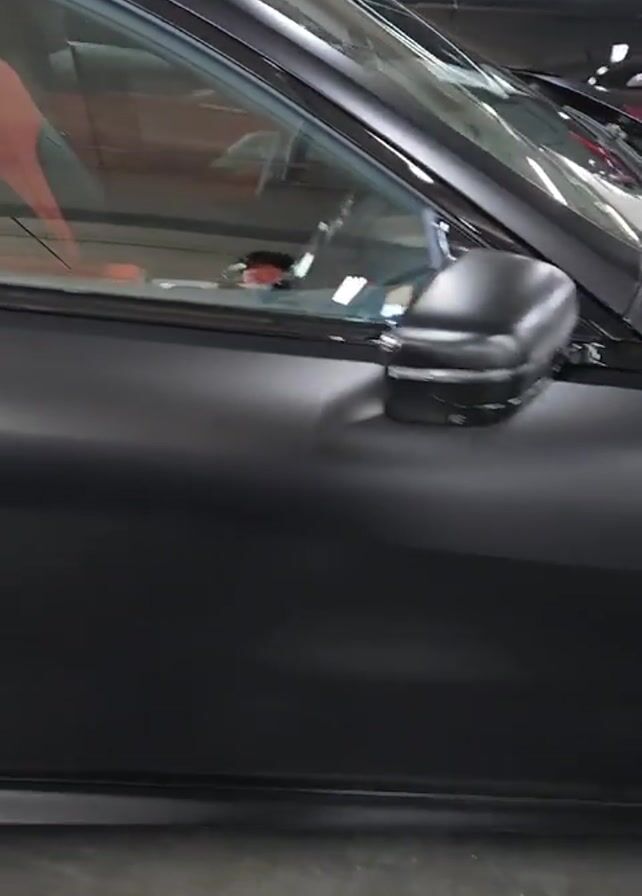 matte black car parked indoors. The camera slowly pans along the side of the car, showing the details of the body, door handle, tires and wheels, and taillight. The interior of the car is visible through the window and appears to be red. A person's face is briefly visible in the reflection on the car window. The floor is gray and appears to be concrete. Other cars are visible in the background.