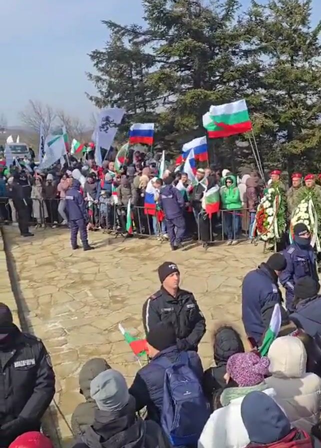 large crowd gathered in an outdoor area. The crowd appears to be standing behind metal barriers, with several uniformed police officers standing at the front. Many people are holding Bulgarian flags and Russian flags, and some are holding white flags with emblems. Green wreaths are visible near the edge of the crowd. The ground is paved with a stone-like pattern. In the background, tall evergreen trees reach towards a clear blue sky. The camera is positioned slightly above the crowd.