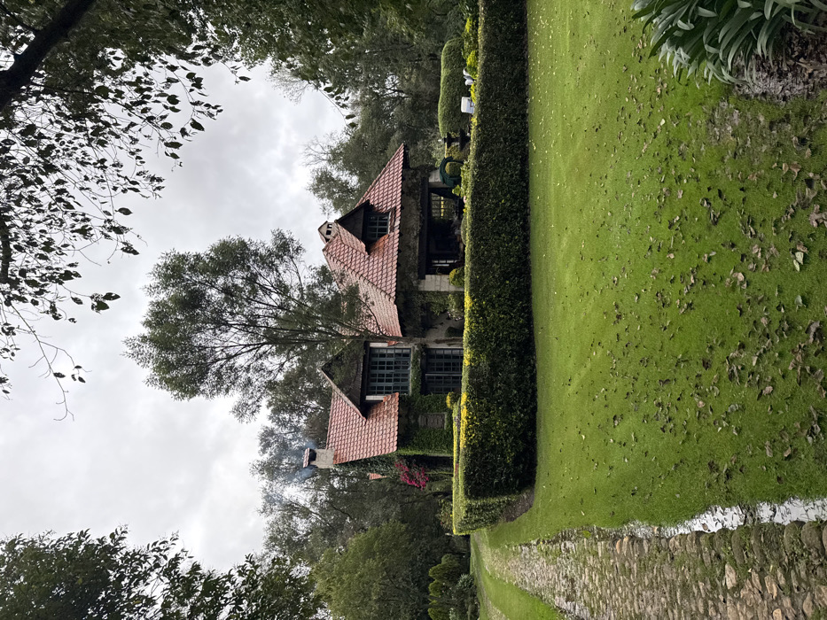 An outdoor, eye-level, slightly elevated photograph captures a rustic, multi-gabled house with a red-tiled roof situated within a lush garden under an overcast sky in Huasca de Ocampo, Mexico