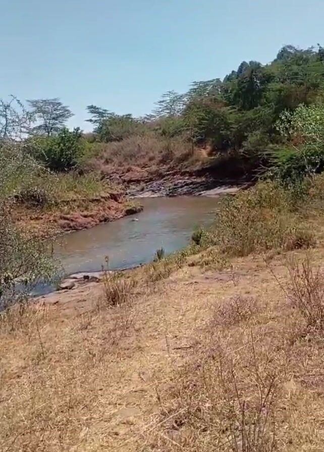 river flowing through a dry landscape. The riverbanks are lined with vegetation, and the surrounding area is mostly brown grass and scattered trees. The sky is clear and blue. The camera pans slightly to the right, offering a wider view of the river and its surroundings. There are no people or animals visible in the video. The scene is peaceful and serene, depicting a natural environment with a river as its focal point.