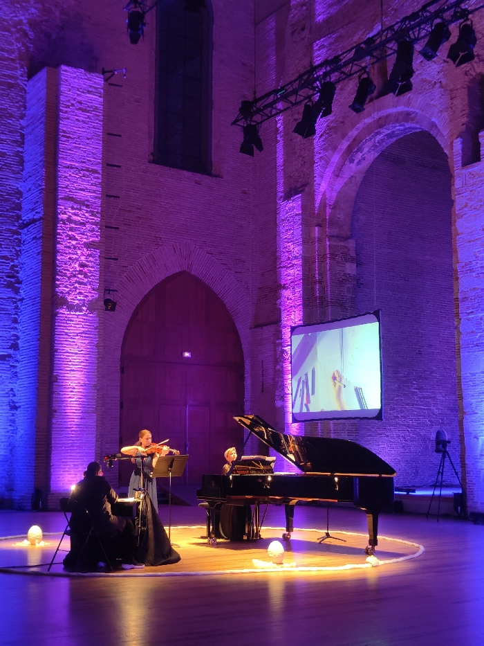 An interior view reveals a performance space within a stone structure, possibly a church or hall, lit with purple and blue hues. A musician plays the violin alongside a pianist at a grand piano. Seated to the left is another figure, likely an accompanist. A white circular cord is placed on the floor. A large screen displays a video above the piano. Stage lighting is visible above, and old gothic arches and masonry frame the scene.