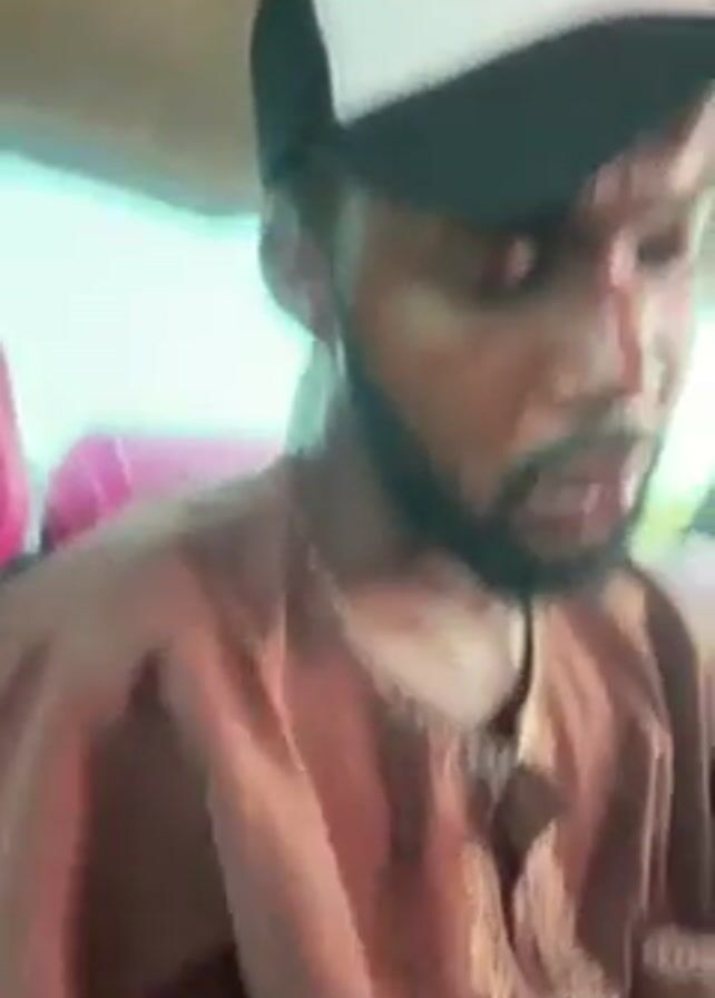 Inside a vehicle, a dark-skinned man is wearing a black and white trucker hat with the name "Ayyub" written on the front. He is also wearing a brown tunic. The man looks down during the video. The background shows car interior and a glimpse outside the window.