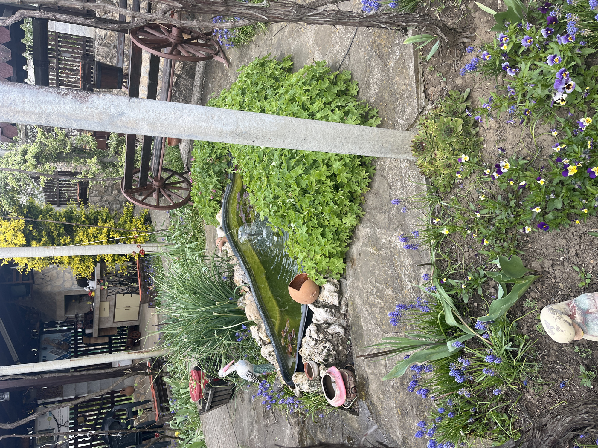 This image shows a garden in Levski, Bulgaria. There is a small pond with green water and various decorations around it, including rocks and broken clay pots. Adjacent to the pond are purple and yellow flowers. In the background, there is a building with a yellow flowering vine and decorative wooden wheels. A metal pole bisects the image. The scene appears to be a private garden.