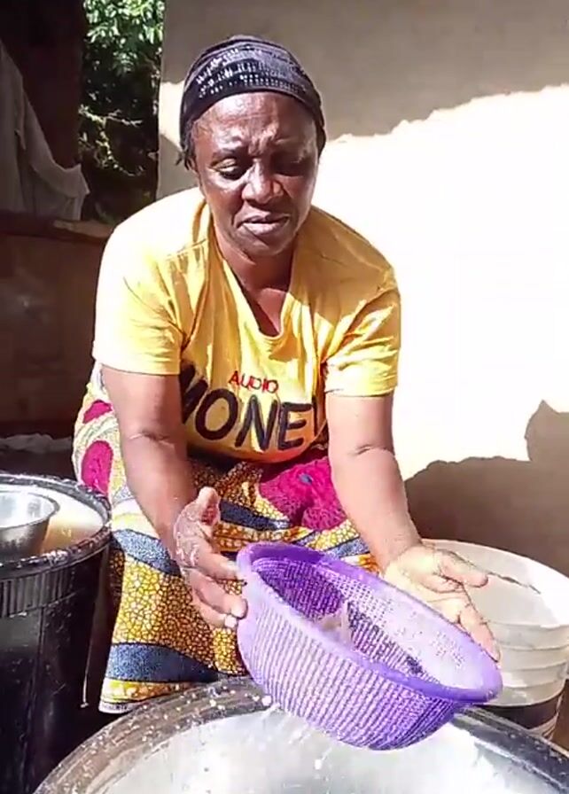 A middle-aged woman is sitting outside in front of a white wall, wearing a yellow t-shirt with the words "AUDIO ONE" printed on it, and a patterned skirt. She's also wearing a black headscarf. She is holding a purple plastic colander filled with white food pieces. Water is being poured through the colander into a large silver bowl. To the left of the woman is a black bucket, and to her right is a white bucket. The background shows some greenery and a partially visible structure. The scene appears to be set during the day with natural lighting.