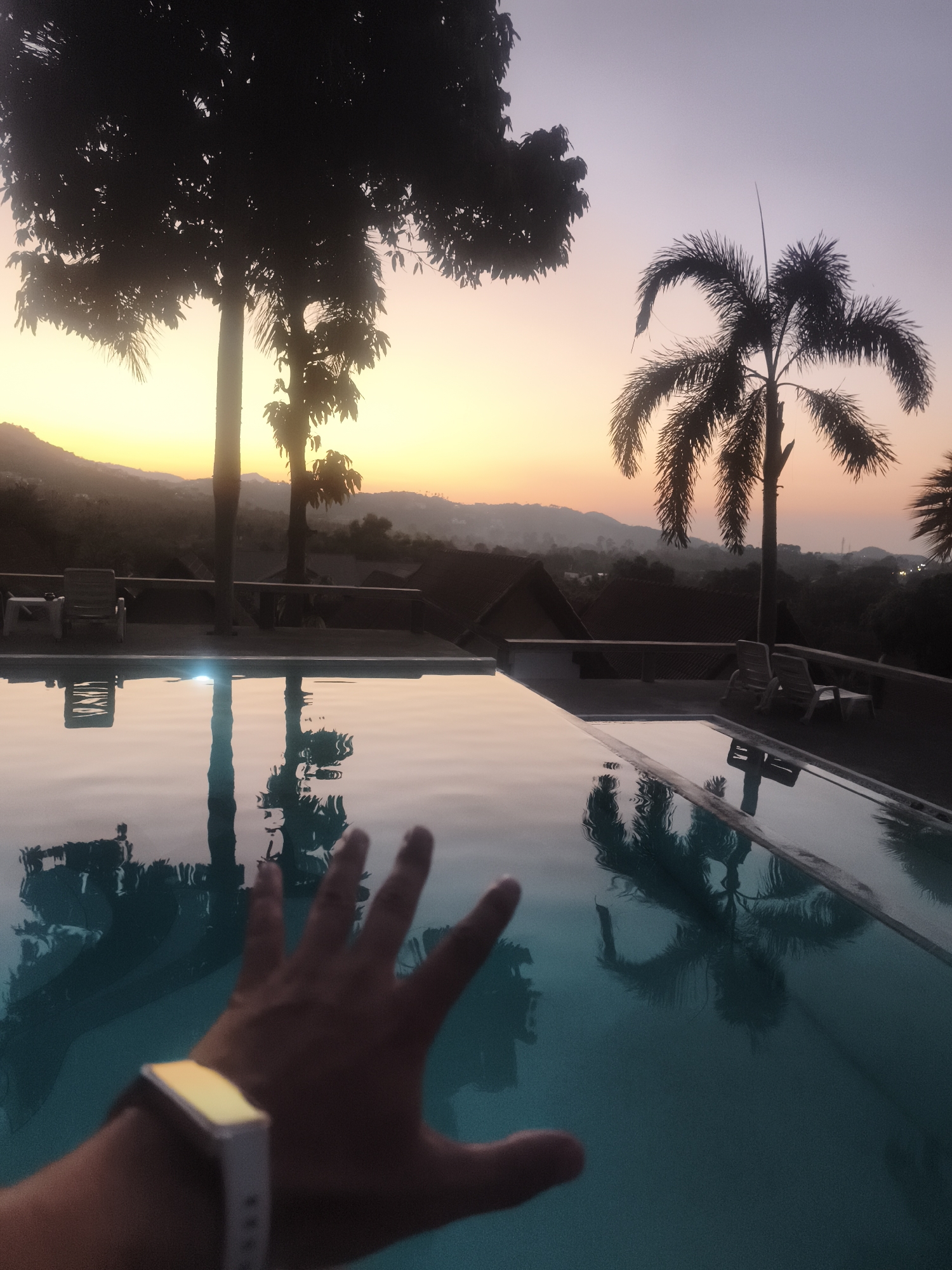 The image depicts an outdoor infinity pool scene at dusk in บ้านบางรักษ์, Thailand. The foreground shows a human left hand, wearing a white smartwatch with a glowing rectangular screen, reaching out over the pool's surface towards the lower-left. The pool water is a calm blue-green, reflecting the sky and silhouettes of surrounding foliage. Beyond the pool, a dark patio area features two empty white plastic lounge chairs and a small white side table. The background is dominated by a sunset sky, transitioning from bright orange and yellow near the horizon to a pale purple and blue overhead. Silhouetted against this sky are several trees: a large, leafy tree with a prominent trunk on the left, a smaller tree next to it, and a distinct palm tree with spiky fronds on the right. Distant hills and mountains are visible as dark silhouettes along the horizon. Below the patio level, rooftops of several buildings are discernable amidst the landscape. The overall lighting is dim, characteristic of twilight.
