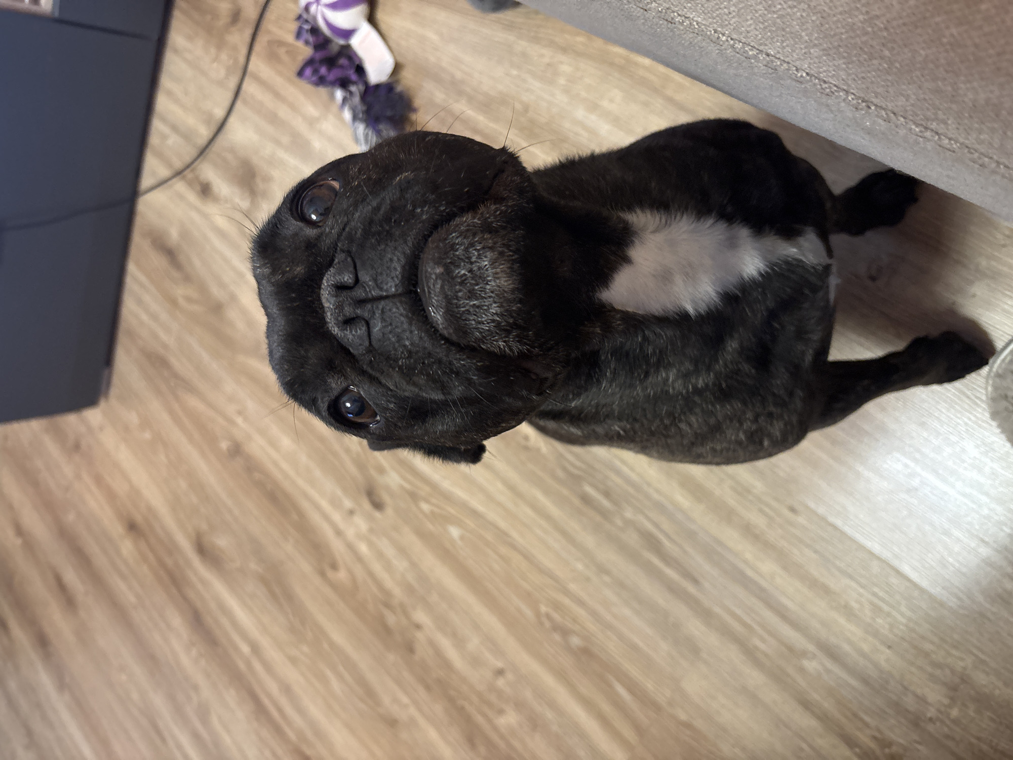 - "A black French Bulldog lies on a light brown laminate floor, looking upwards" by FM-Gih8w2, licensed under CC BY 4.0