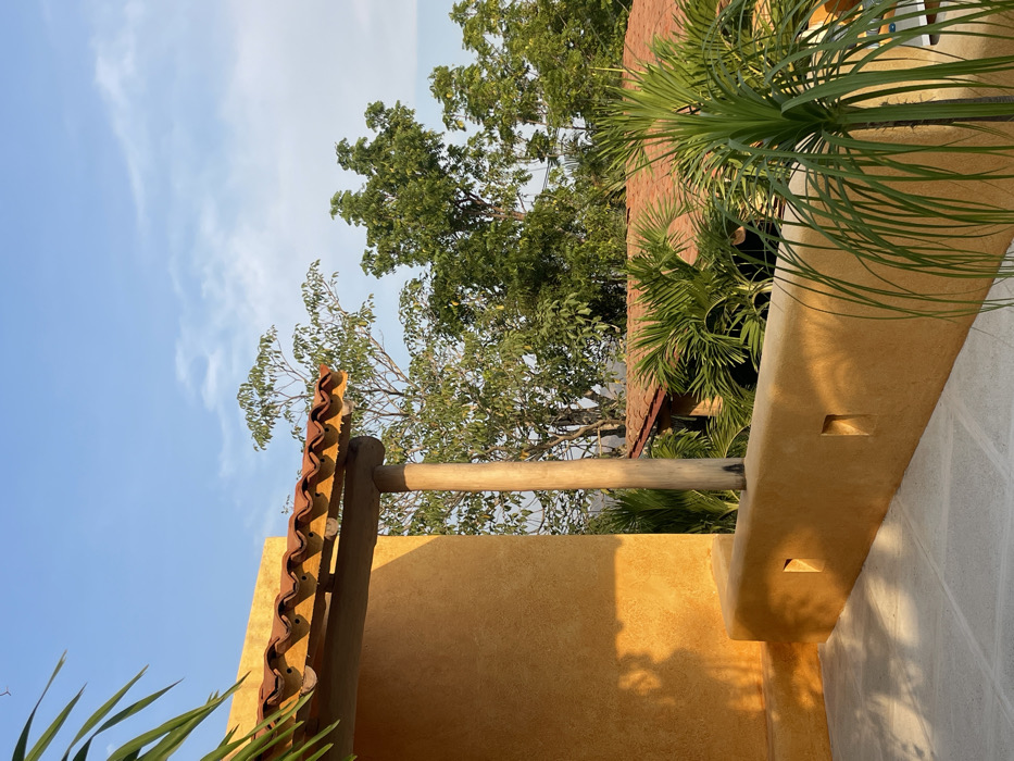 View of a tan-colored building with an orange roof and a light blue sky. Green trees and palm trees are visible above the roof. The building has a wooden beam and tiled details. The sun casts shadows across the building's textured walls.