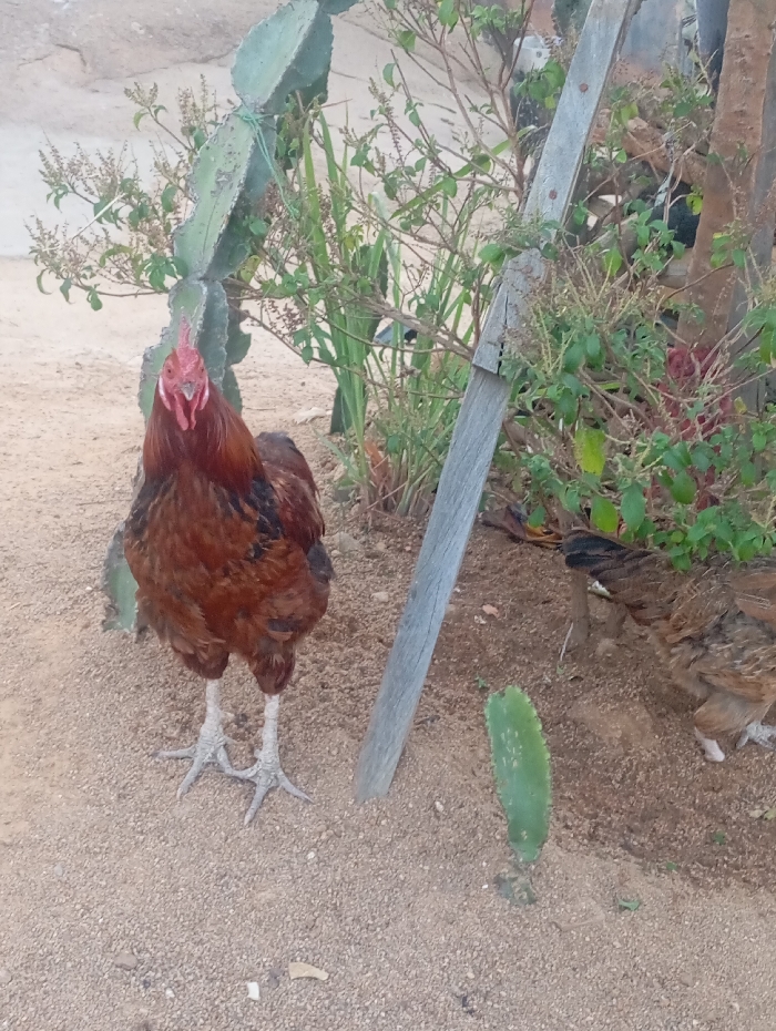 A rooster stands prominently in a gravelly yard, gazing directly at the camera. Its plumage is predominantly reddish-brown. Behind the rooster, various plants thrive, including a cactus and leafy green foliage. A weathered grey wooden post leans at an angle. A second chicken is partially visible.