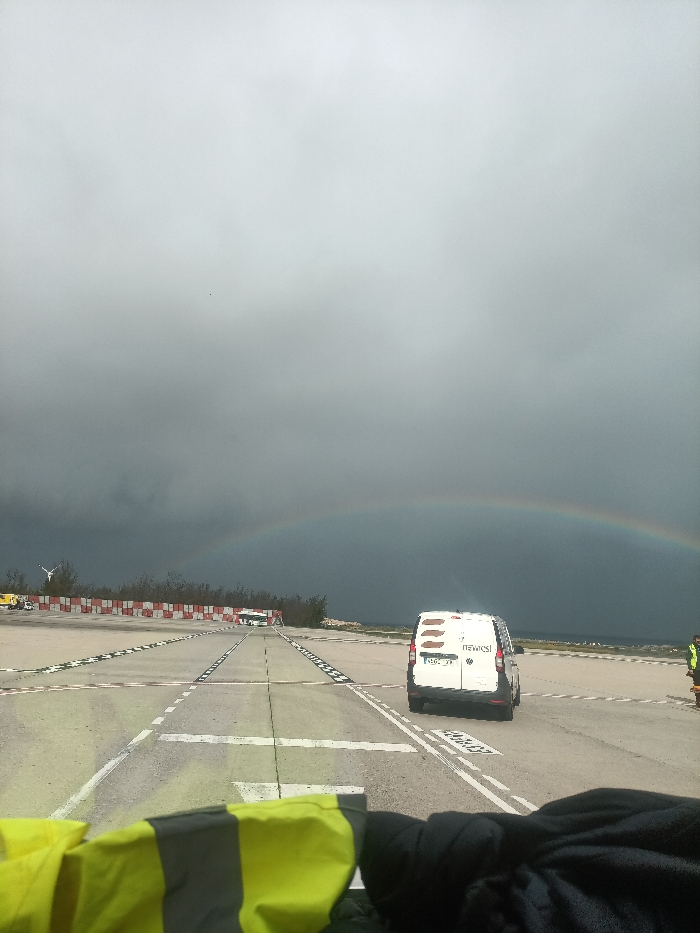 A rainbow arches over an airport runway under a stormy, overcast sky. A white van with “NEWPCS” on its side drives on the runway. The runway has white lines and markings. A bus is parked on the left side. A person in a yellow safety vest stands on the right side. The foreground shows parts of a yellow safety vest.