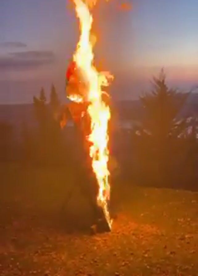 A tall bonfire burns on a grassy hill at dusk. The flames are tall and reach high in the air. The sky behind the fire is a dusky blue and orange. In the background, there are trees and a body of water. The camera is stationary and the focus is on the bonfire. The mood is intense, perhaps celebratory or ritualistic. Someone can be heard yelling.
