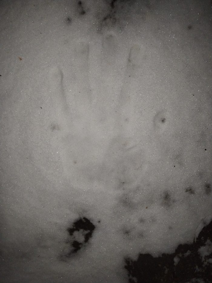 The image presents a close-up view of a snow-covered surface. Dim lighting obscures detail, making it difficult to discern specific forms. There appear to be subtle depressions or indentations, possibly footprints, suggesting movement across the snow. Patches of dark matter are at the bottom right corner and slightly to the center left. The snow has a grainy texture, punctuated by scattered specks.