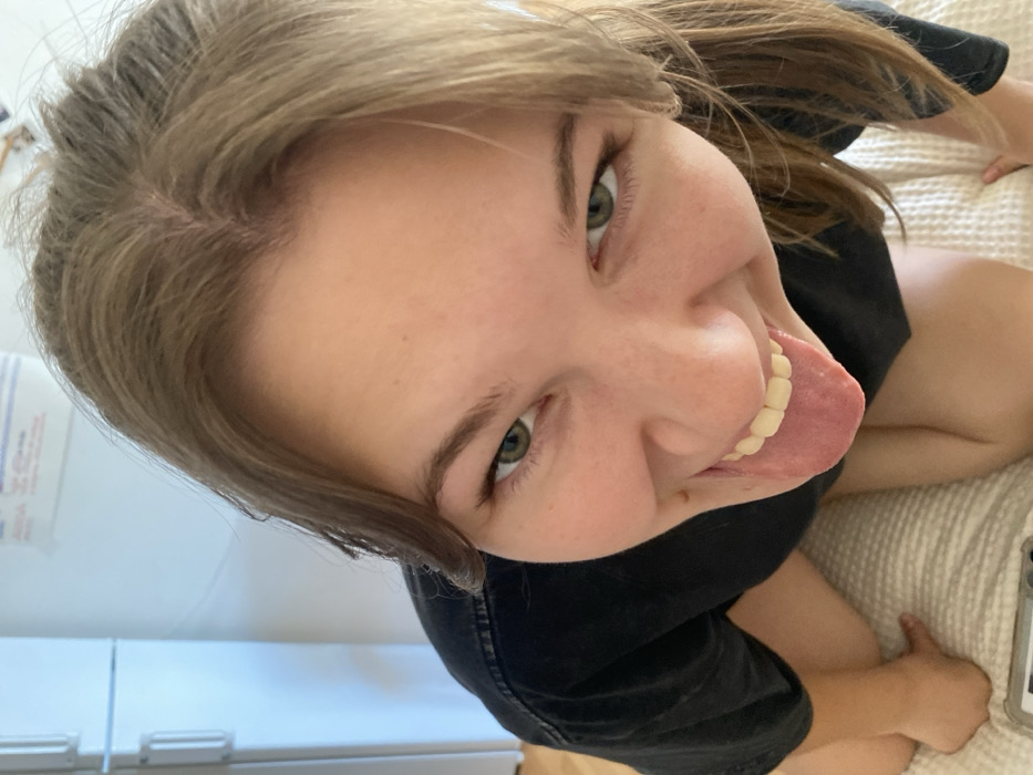 A young woman with fair skin and green eyes looks up at the camera, sticking out her tongue