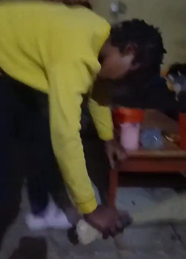 A person is sweeping a floor in a room. The person is wearing a yellow long-sleeved shirt and black pants. The person is bent over and using a broom to sweep the floor in front of a small table. The table is holding various items. The floor is tiled. There is a sofa visible in the background, with some items on it. There is also a curtain and some pictures on the wall. The room appears dimly lit.