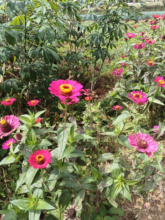 A vibrant cluster of pink and magenta zinnias with yellow centers dominates the foreground. The flowers are interspersed with green leaves, some showing signs of insect damage. Behind the zinnias, a dense, leafy green shrub provides a backdrop. A hint of cultivated land with visible rows of crops appears in the distance, suggesting a garden or agricultural setting. The overall scene is bright and filled with natural light.