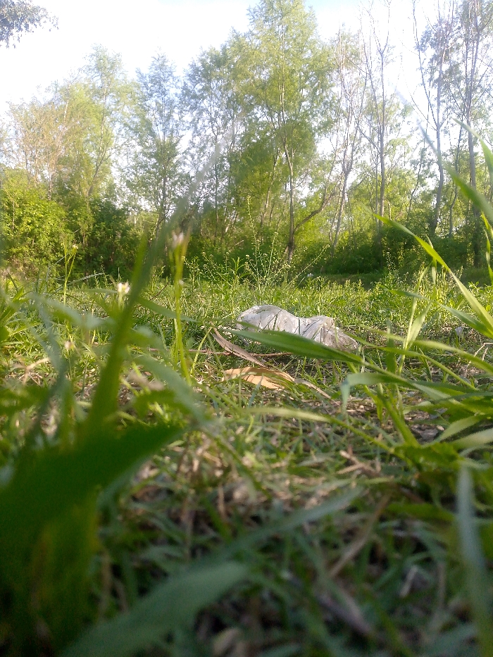 This image captures a low-angle, ground-level perspective of a natural, overgrown area in Janu Mandi, Pakistan. The foreground is dominated by sharply focused green grass and various small plants, including some with tiny white blossoms. In the midground, a crumpled, light-colored object, consistent with a discarded plastic bag or a piece of white fabric, lies horizontally on the grass, surrounded by scattered dry leaves and organic debris. The background consists of a dense arrangement of deciduous trees with varying shades of green foliage and visible branches, suggesting a wooded edge or thicket. The sky above the tree line is bright, indicating natural daylight conditions. No individuals, actions, or specific interactions are depicted within the scene.