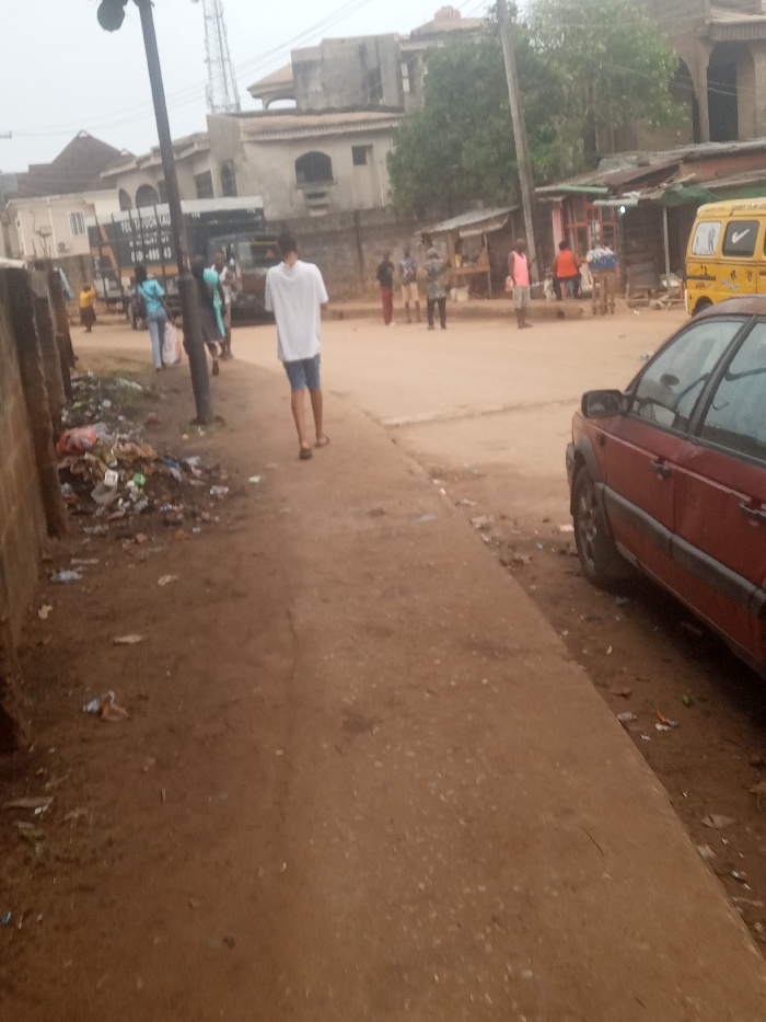 A street scene unfolds on a cloudy day. Debris lines the left sidewalk, and a person in a white shirt and shorts walks away from the camera. Across the intersection, a cluster of people gathers near modest commercial structures and a yellow vehicle. A burgundy car sits on the right edge of the frame. Buildings of varying heights are visible in the background, along with a communication tower, giving a glimpse into an urban residential area.