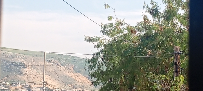 The image presents an outdoor, high-angle view of الشيخ حسين قرية, Jordan. A dark, vertical structural element partially obscures the right side of the frame. A dense, green-leafed tree is prominent in the mid-right, with a wooden utility pole positioned behind it, supporting multiple dark wires that stretch across the mid-ground. Below the wires and the tree, portions of the village are visible, consisting of light-colored buildings, some featuring domes and minarets. The background is dominated by a substantial, light brown, rocky mountain range, exhibiting some sparse green vegetation on its higher elevations, against a light blue, hazy sky. No individuals or specific activities are observed.