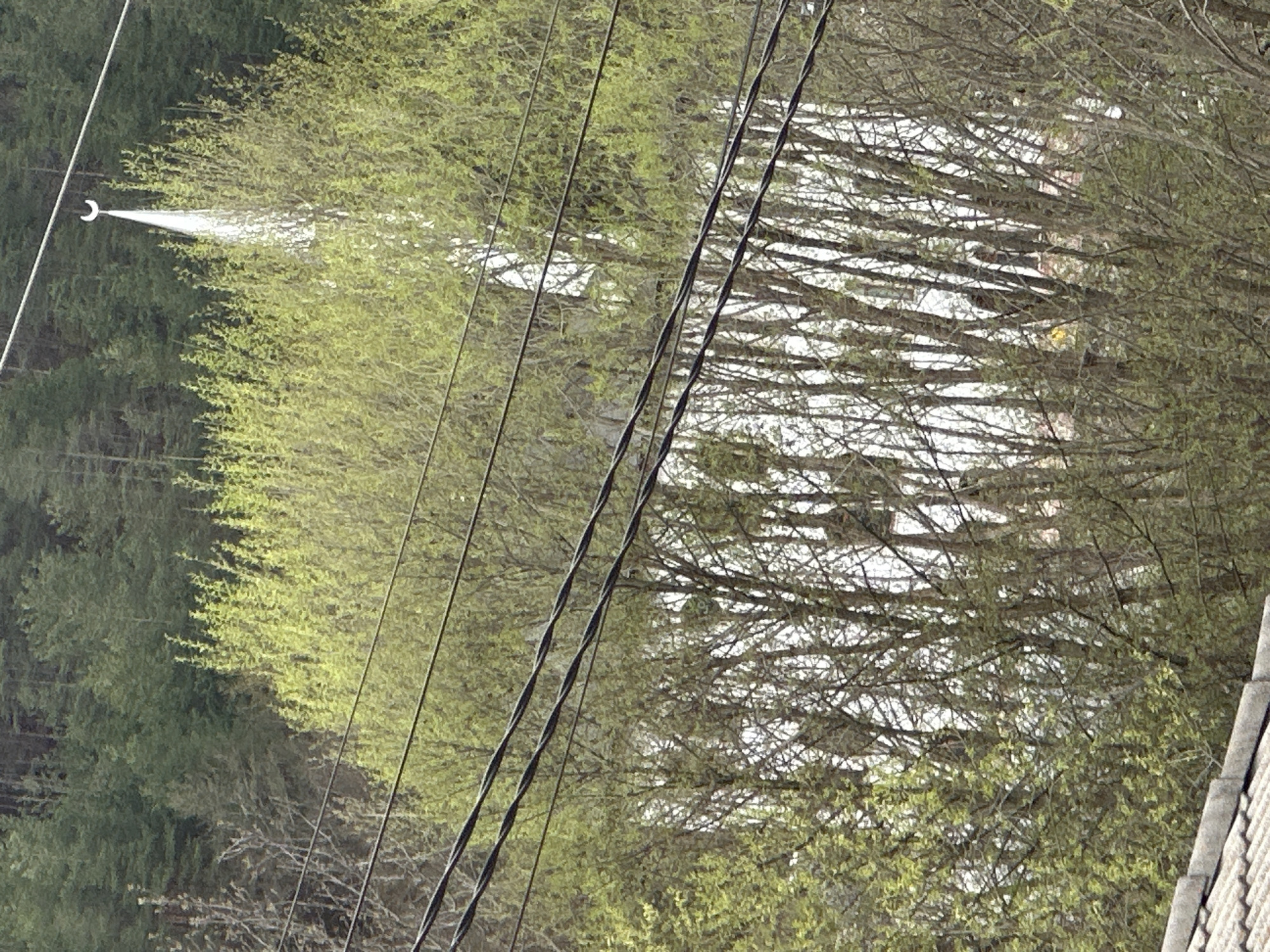 rural scene, likely in Chepintsi, Bulgaria. Utility lines cross the frame. There is a line of trees with green foliage and a structure partially obscured by trees with bare branches. A sprinkler head ejects water. A portion of a roof is visible in the lower right corner.