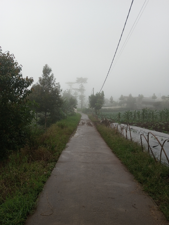 A narrow, wet concrete road stretches into dense fog. Lush green vegetation lines both sides. To the left, a variety of leafy trees and shrubs thrive. To the right, crops grow under plastic sheeting, supported by metal frames. Power lines run overhead. The overall scene evokes a sense of tranquility, yet the fog obscures the distance, creating an atmosphere of mystery.