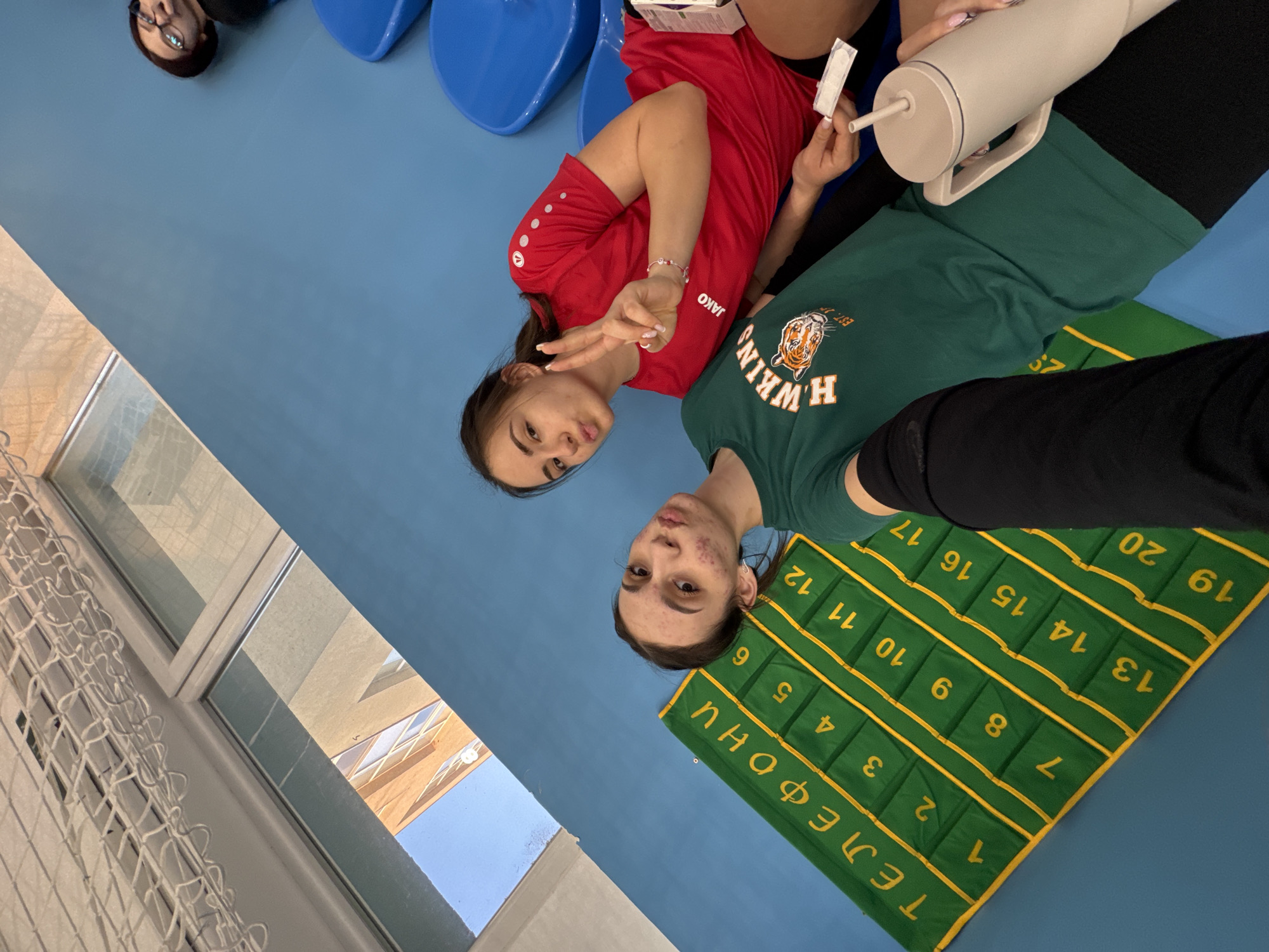 The image captures an indoor scene within what appears to be a sports hall or recreational facility in Kozloduy, Bulgaria. The background consists primarily of a light blue wall, along which rows of blue molded plastic seating are visible on the right side. At the top left, multiple window panes reveal a clear blue sky and a reflection of an exterior building featuring a light brown facade. Above the windows, a white mesh or lattice structure is present. Three individuals are depicted. In the foreground, a young female with dark hair and visible facial acne wears a dark green t-shirt emblazoned with "HAWKINS EST. 1983" and a tiger graphic, paired with black athletic leggings. She extends her right arm to take a selfie, making a pouting expression towards the camera. A large, light beige insulated mug with a straw is positioned near her. To her immediate right, a second young female, wearing a red short-sleeved athletic shirt with "JAKO" branding and dark shorts, is seated on a blue plastic chair. She poses for the camera with a peace sign made by her right hand and a kissing expression on her face. A red bracelet is visible on her left wrist, and she holds a small white rectangular object in her left hand. In the far background, partially visible on the right, a third individual wearing glasses and a dark hat or beanie is also seated on a blue plastic chair, looking towards the camera. Mounted on the blue wall to the left of the central figures is a large green fabric board with yellow outlining, featuring the Bulgarian word "ТЕЛЕФОНИ" (Telephones) at the top, followed by numbered pockets from 1 to 20 arranged in rows.