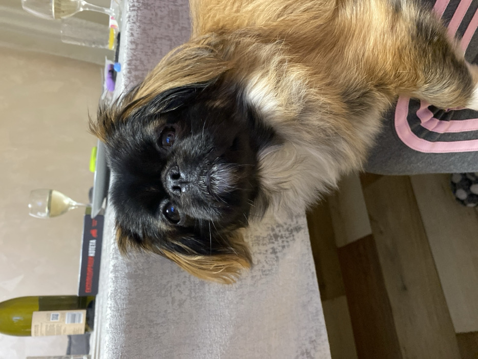 - "A small dog, resembling a Shih Tzu or Pekingese with brown and tan fur, a black facial mask, and white chest markings, is positioned in the foreground, looking directly at the viewer" by FM-uDJxI2, licensed under CC BY 4.0