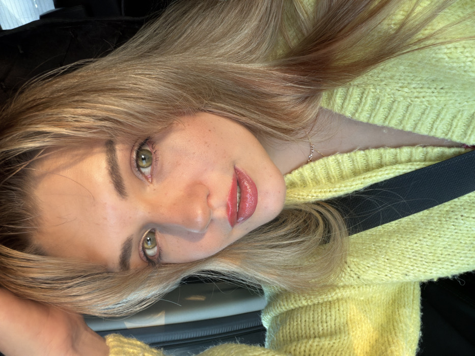 A close-up portrait features a young Caucasian female. She possesses long, light blonde hair styled with bangs, green eyes, and fair skin with scattered freckles visible on her nose and cheeks. Her lips are coated with a red-pink glossy product, and her eyelids exhibit a light, possibly gold-toned, cosmetic application. She is attired in a light yellow, possibly knitted, cardigan or sweater. A black seatbelt strap is positioned diagonally across her chest. A delicate necklace with small letter beads spelling "princess" rests on her neck. Her left hand is partially visible in the upper left quadrant, appearing to touch her hair. The subject looks directly at the camera. The background is dark, out of focus, and indistinct, characteristic of an interior or vehicle setting. A faint vertical light-colored element is present on the far left. The lighting is natural, casting subtle shadows. The exact location within the city of Азьмушкино, Russia, cannot be determined from the visual information in the image.