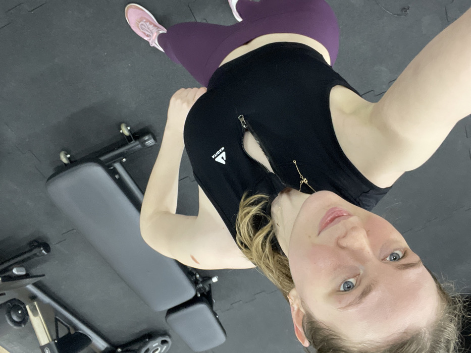 This image captures a female individual from a high-angle perspective within a fitness facility, located in the city of Kommunarka, Russia. The subject has light-colored hair and blue eyes, looking directly into the camera with a subtle smile. A reddish abrasion is visible on her upper right arm. She is wearing a black sleeveless athletic top, bearing the brand "NADIYA" on the chest, with a partially unzipped front zipper. Her lower attire consists of dark purple athletic leggings and light pink athletic shoes. The floor is covered with dark, interlocking rubber tiles. In the background, a black adjustable weight bench and a portion of a weight machine with a circular weight plate are visible. The individual is positioned as if posing for a photograph.