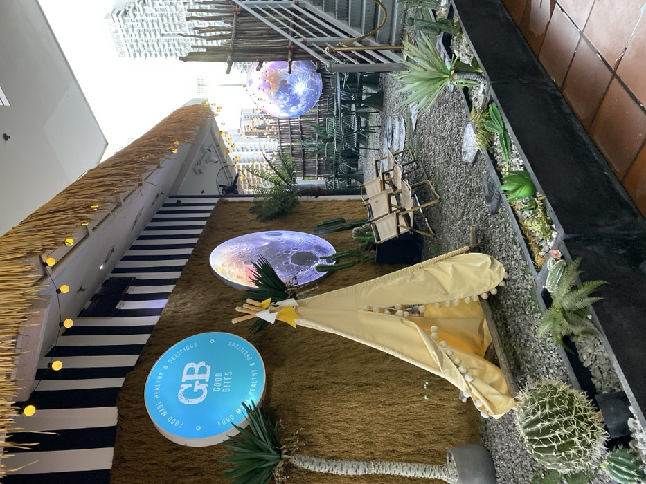 This image depicts an outdoor or semi-outdoor dining area belonging to "Good Bites" restaurant, located at Bishan Sports Hall, 5 Bishan Street 14, Singapore. The scene features a themed environment characterized by a thatched roof overhang and a wall covered in what appears to be dried natural fibers, possibly straw or hay, above which is a black and white striped panel. Prominently displayed on the fiber-covered wall are two large, circular illuminated signs. The sign on the left is light blue with white text, reading "GB GOOD BITES" and "FOOD MADE HEALTHY & DELICIOUS." To its right, a similar circular panel displays an illuminated image of a cratered moon. Further to the right and in the background, another large circular illuminated panel shows an earth-like celestial body. In the foreground, a light yellow teepee tent with white pom-pom trim on its opening is erected on a gravel surface. A large barrel cactus and several other succulents are visible in dark planters surrounding the teepee. The ground consists of light grey gravel with irregular dark stepping stones. Two light-colored wooden folding chairs are placed on the gravel near the center of the image. In the mid-ground, a dining area with multiple green metal tables and chairs is visible, enclosed by a fence constructed from vertical wooden poles. A staircase with a rope railing descends on the right side of the image, leading down from an unseen upper level. Decorative elements include artificial palm trees and a string of yellow globe lights suspended under the thatched overhang. Tall, modern city buildings form the backdrop against a bright, overcast sky. The scene is devoid of people or visible activity.